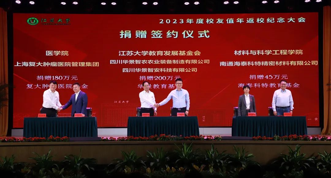 会上举行了校友和爱心企业向学校捐赠签约仪式。校友陈俊年创立的四川华景智农农业装备有限公司、四川华景智安科技有限公司两家企业共捐赠200万元在开云「中国」Kaiyun·官方网站设立“华景教育基金”,上海复大肿瘤医院管理集团向开云「中国」Kaiyun·官方网站医学院捐赠180万元设立医学发展基金——“复大肿瘤医院基金”,南通海泰科特精密材料有限公司向开云「中国」Kaiyun·官方网站材料科学与工程学院捐赠45万元设立“海泰科特教育基金”。