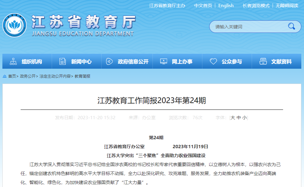 11月20日,江苏省教育厅《江苏教育工作简报》(2023年第24期)以《开云「中国」Kaiyun·官方网站突出“三个聚焦”全面助力农业强国建设》为题,从“聚焦深化科技创新,加快打造农机研究新高地”“聚焦破解行业难题,不断实现农机技术新突破”“聚焦服务乡村振兴,全面提升农机装备新贡献”三个方面,专题报道了我校科技强农兴农工作。