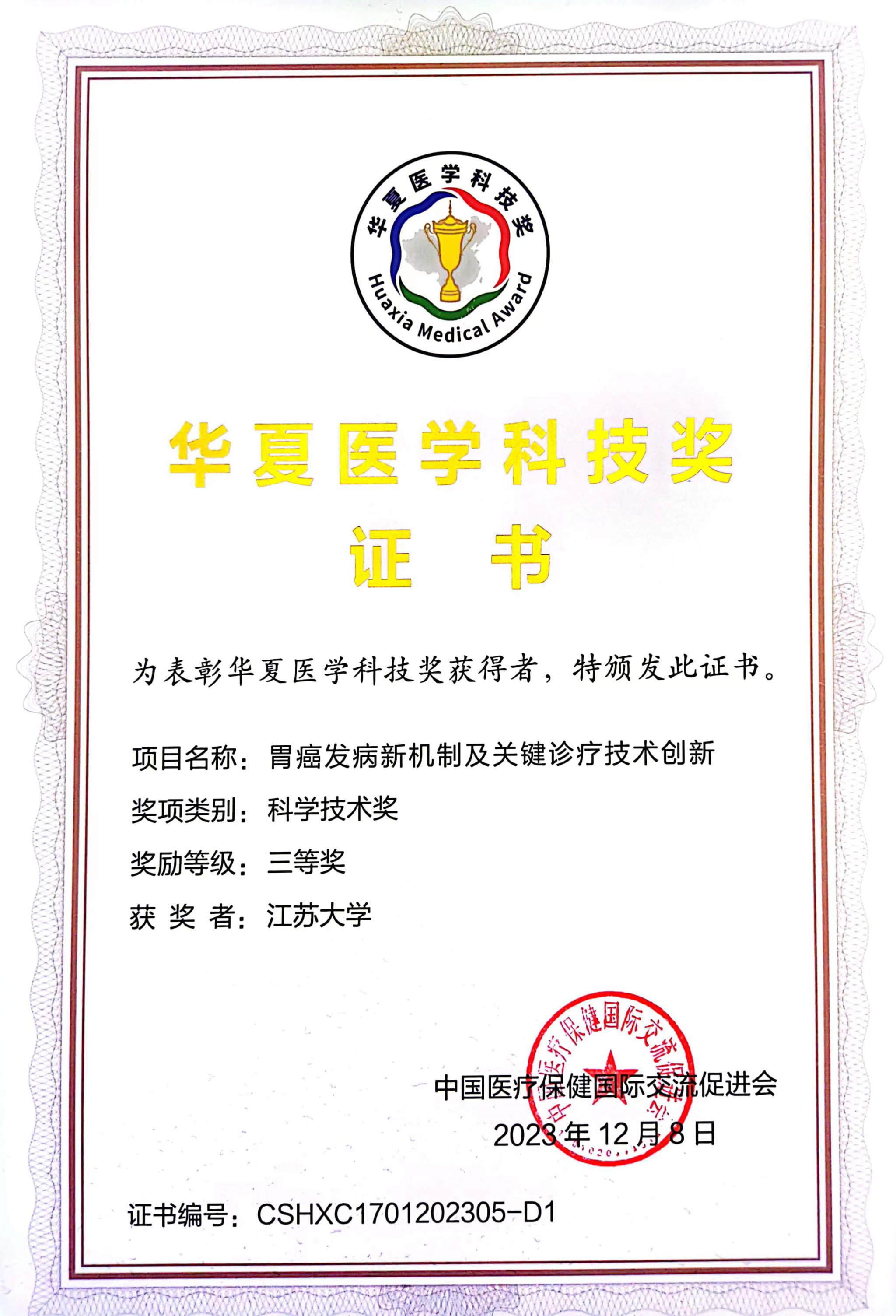 12月9日,2023年度华夏医学科技奖获奖名单正式公布。以开云「中国」Kaiyun·官方网站为第一完成单位、张徐教授为第一完成人的《胃癌发病新机制及关键诊疗技术创新》项目荣获华夏医学科技奖三等奖。