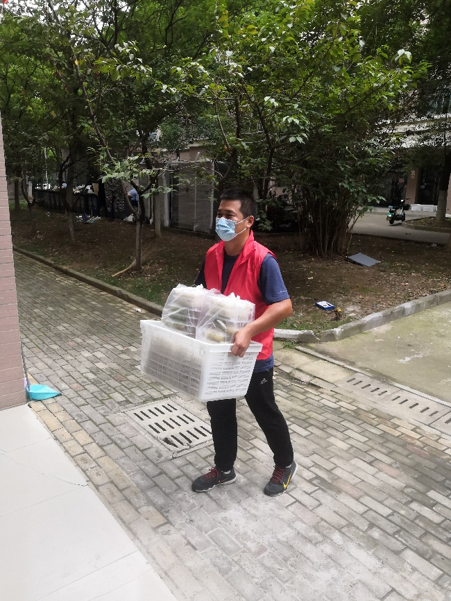 9月28日早上,胡志超、唐晓红两名老师迅速响应学校征集志愿者的号召,收拾好行囊赶到学校。当学院招募2名送餐志愿者时,刘玉成、梁振伟两位2秒之内就完成了报名。每次送餐都忙得大汗淋漓,梁振伟也开着玩笑说,“每天要完成一百多套的送餐任务,没有点肌肉还真不行!”