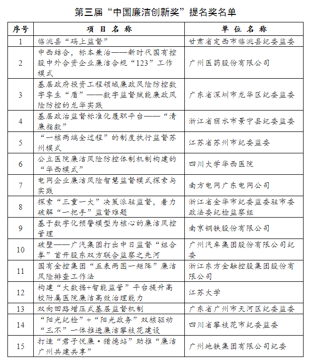 “中国廉洁创新奖”由中国管理现代化研究会廉政建设与治理研究专业委员会与清华大学廉政与治理研究中心倡议并组织的评选活动,面向全国公开征集项目。2022年,全国共有174个项目参评,评审会专家按照创新程度、重要程度、效益程度、持续程度、推广程度五个方面的标准,初步筛选出21个入围项目,再通过入围单位陈述、专家提问、入围单位回答等环节,对项目进行独立投票和打分。最终6个项目获得“中国廉洁创新奖”,15个项目获得提名奖。