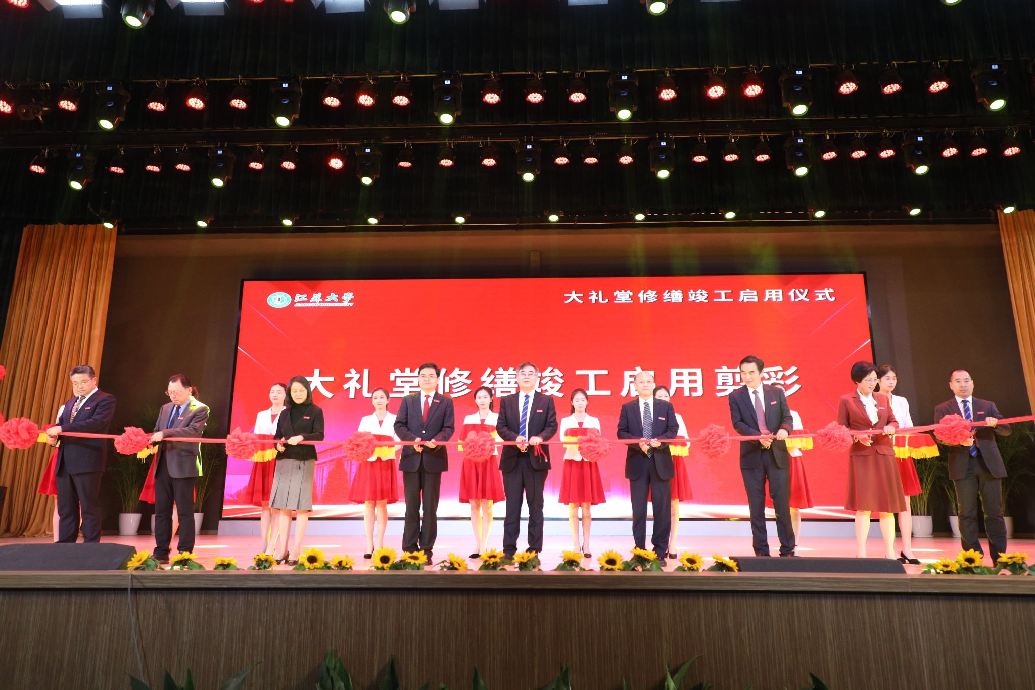 在欢腾的醒狮表演中,全体参会校领导和党委常委为大礼堂修缮竣工启用剪彩,标志着升级换代后的大礼堂正式投入使用。