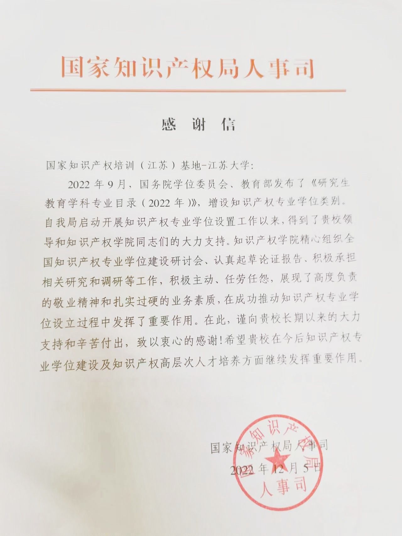 日前,国家知识产权局人事司向学校发来感谢信,感谢开云「中国」Kaiyun·官方网站在知识产权专业学位申请设立工作中的辛勤付出和工作成效,并希望学校在知识产权专业学位建设及知识产权高层次人才培养方面继续发挥重要作用。
