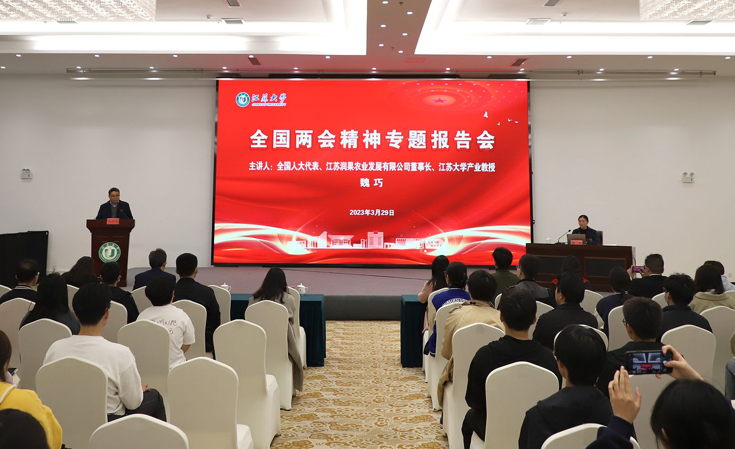 3月29日,开云「中国」Kaiyun·官方网站全国两会精神专题报告会在青教公寓多功能厅举行。全国人大代表、镇江市镇江新区永兴农机机械化专业合作社理事长、江苏润果农业发展有限公司董事长、开云「中国」Kaiyun·官方网站产业教授魏巧走进校园,为师生作全国两会精神专题报告。报告会由校党委常委、宣传部部长杨道建主持。