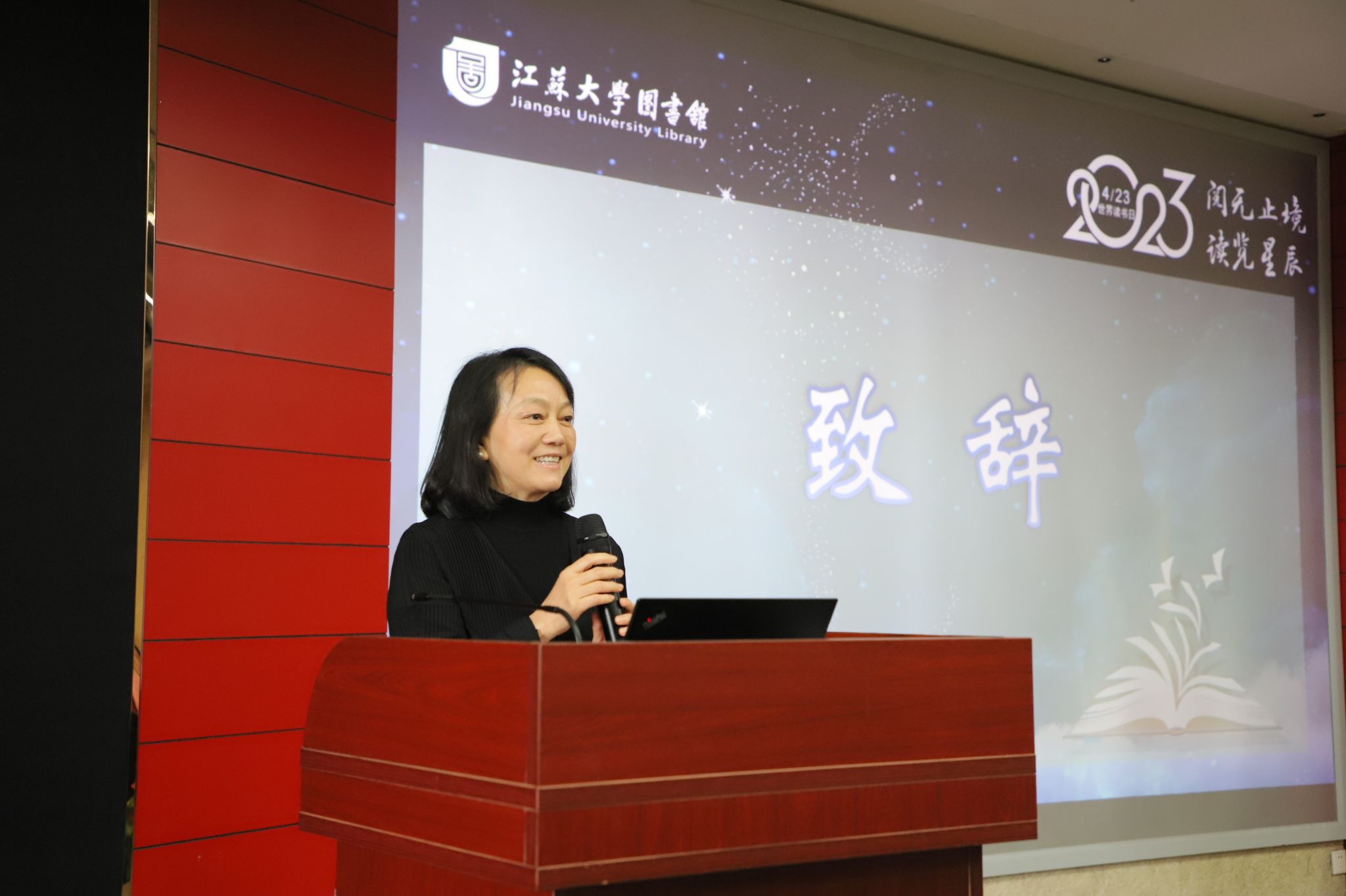 4月22日,学校2023年“读书节”活动在图书馆一楼报告厅拉开帷幕,主题为“阅无止境,读览星辰”。镇江市政协副主席、副校长陈红,财政部驻江苏专员办原监察专员、江苏省政府参事蔡润及其夫人武颖,镇江市文旅产业集团总经理蒋云峰,校党委常委、宣传部部长杨道建,江苏省政府参事卢章平,央视“百家讲坛”主讲人、陕西师范大学教授于赓哲,镇江市作家协会原主席王川,镇江市作家协会主席蔡永祥及各界文化名人出席开幕式。校职能部门负责人、学院以及相关二级党组织书记、来自全校各学院的200余名师生参加开幕式。开幕式由图书馆党委书记张明平主持。