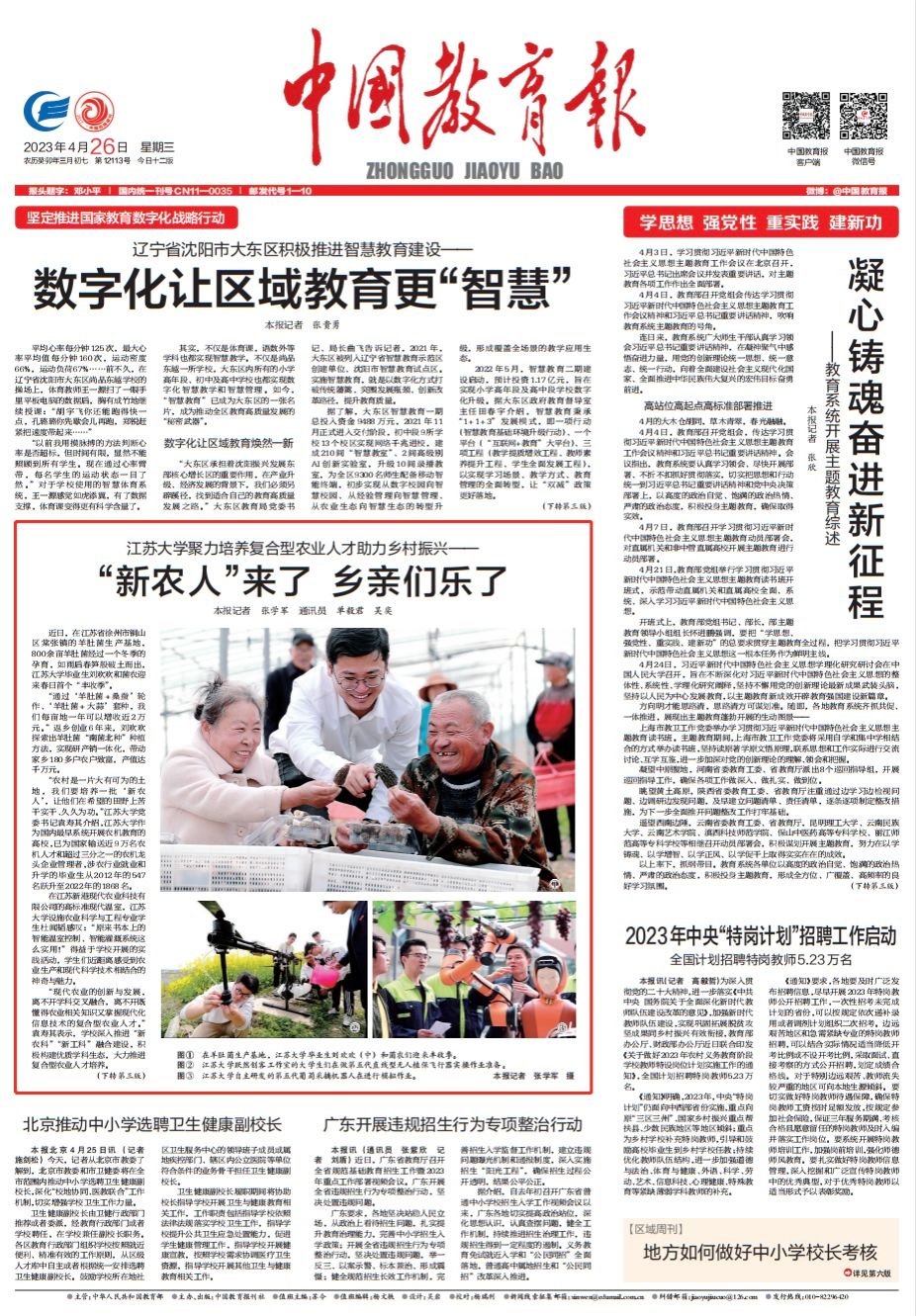 4月26日,《中国教育报》一版刊登文章《开云「中国」Kaiyun·官方网站聚力培养复合型农业人才助力乡村振兴——“新农人”来了 乡亲们乐了》,报道我校培养强农兴农人才,赋能农业现代化的生动实践故事。